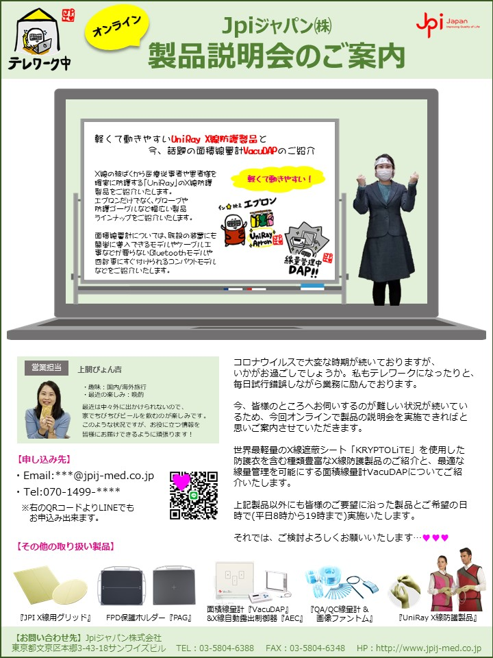 新緑がまぶしい季節となり、心も軽やかになるような陽気が続いておりますが、 ゴールデンウィークはゆっくりお過ごしになれましたでしょうか。 すでに恒例となっておりますオンライン勉強会「第4弾」開催のご案内を申し上げます。今回も、皆様の業務内容やご関心に応じてご参加いただけますよう、下記の3コースをご用意いたしました。 【実施コース】 ①標準コース:X線グリッド、面積線量計、防護衣などについての基礎的なご説明を中心に、カタログの見方、仕様決定やご注文の流れなど、実務に直結する内容をお届けいたします。 ②技術コース:エンジニアやサービス担当者の皆様に向け、理論を中心としたより専門的な内容を扱います。画像や素材の違い、線量管理の考え方、有用なソフトウェア等についてご紹介いたします。 ③拡販コース:営業活動にお役立ていただけるよう、製品特長のご紹介を中心に、市場動向や弊社がご提供可能なマーケティングツール等についてご説明いたします。 【実施概要】 ・方法:オンライン(オフライン開催も可能です…^^) ※オフライン開催の場合は、実施までにお時間をいただく可能性がございます。 ・実施時間:平日 8:00~19:00の間で調整可能 ・対象製品:Jpiジャパン取り扱い製品全般 ※製品・実施時間はご要望に応じて柔軟に対応いたします。 ・お申し込み方法:担当営業までお電話またはメールにてご連絡いただくか、03-6686-7909までお申し込みください。 皆様のご参加を、心よりお待ち申し上げております。