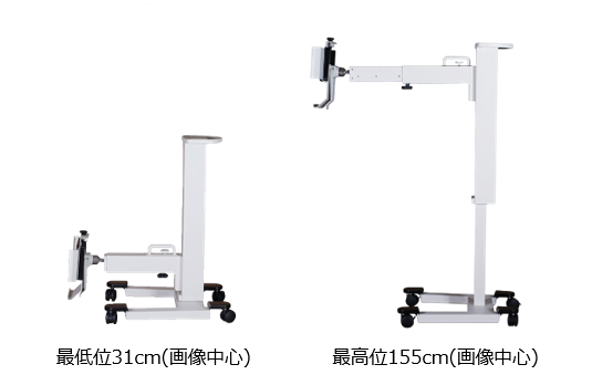 10×12インチ~17×17インチのFPDやFPD保護ホルダーを装着することができます。総重量はわずか39kgで、ケーブルが多い手術室でもスムーズに移動できます。高さは31cm~155cm(画像中心部)まで調整可能で、受像部の角度も自由に固定できます。
